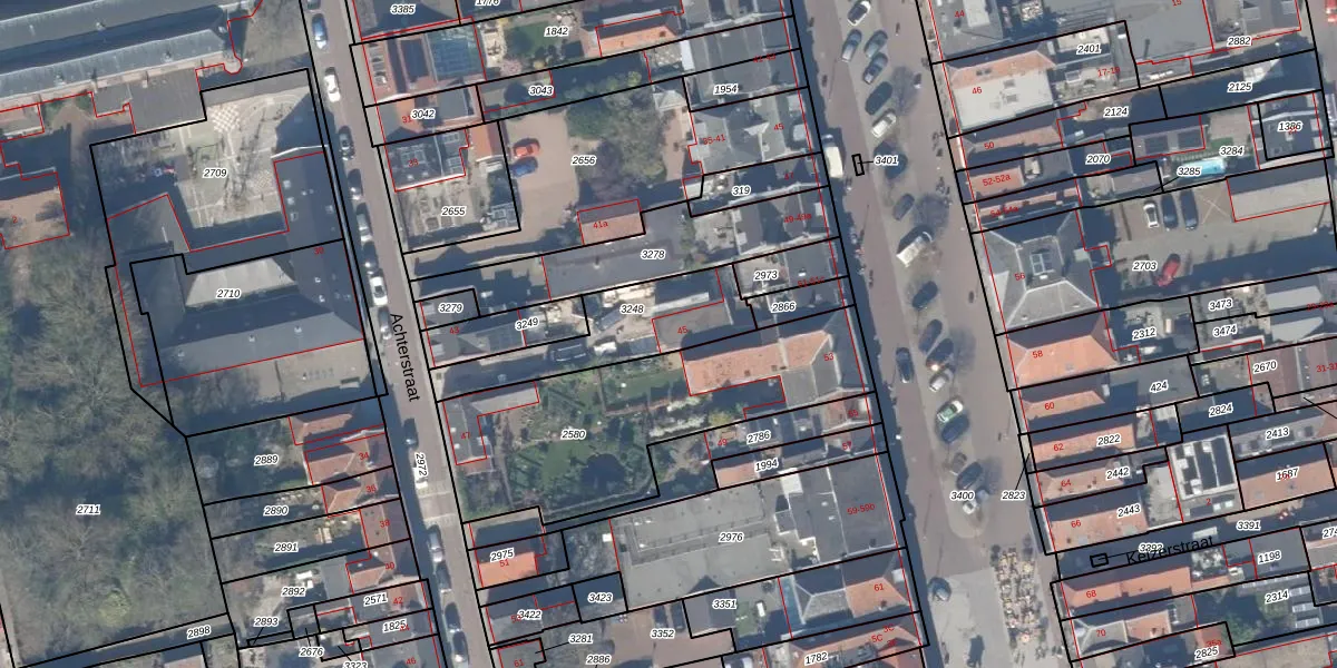 Het perceel waarop Achterstraat 45 staat heeft een oppervlakte van 364 m². Dit is een groot perceel. De perceeloppervlakte wordt geregistreerd door het Kadaster. Gedetailleerde informatie over de maten van dit perceel kunt u vinden in het rapport Kadastrale kaart met maatvoering van Achterstraat 45.