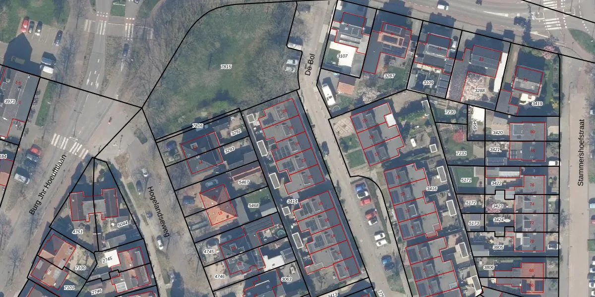 Het perceel waarop De Bol 24 staat heeft een oppervlakte van 1383 m². Dit is een zeer groot perceel. De perceeloppervlakte wordt geregistreerd door het Kadaster. Gedetailleerde informatie over de maten van dit perceel kunt u vinden in het rapport Kadastrale kaart met maatvoering van De Bol 24.