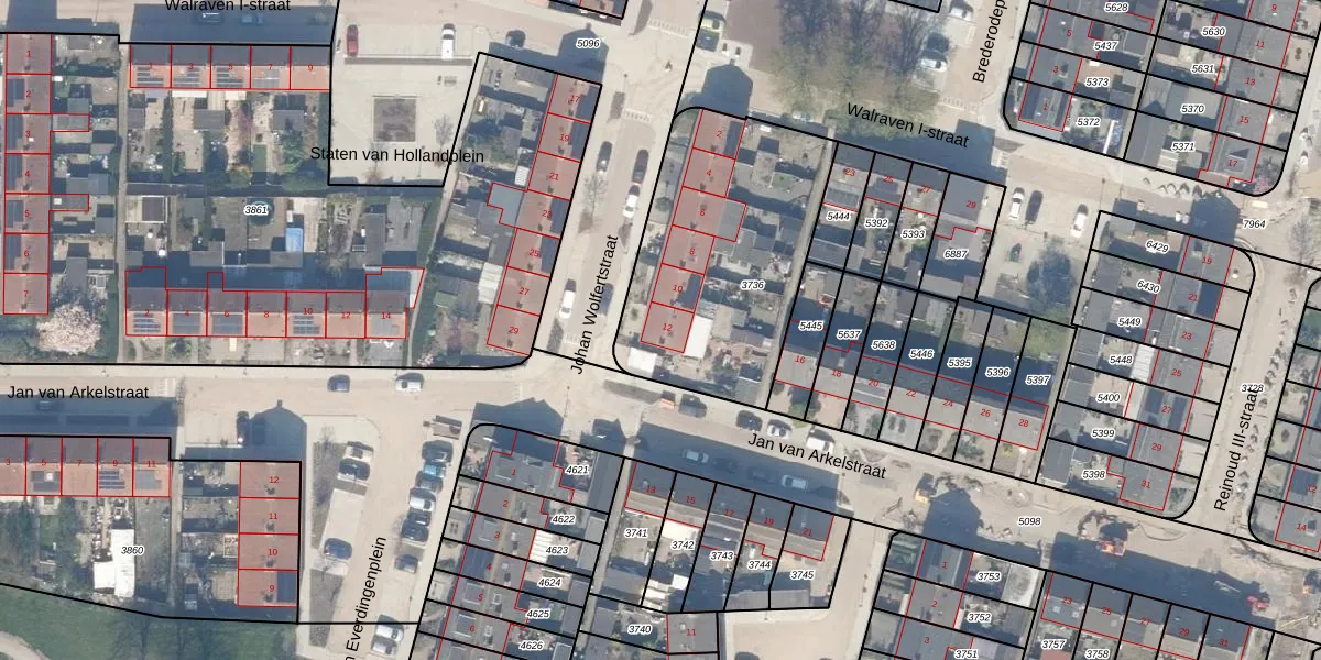 Het perceel waarop Johan Wolfertstraat 12 staat heeft een oppervlakte van 1036 m². Dit is een zeer groot perceel. De perceeloppervlakte wordt geregistreerd door het Kadaster. Gedetailleerde informatie over de maten van dit perceel kunt u vinden in het rapport Kadastrale kaart met maatvoering van Johan Wolfertstraat 12.