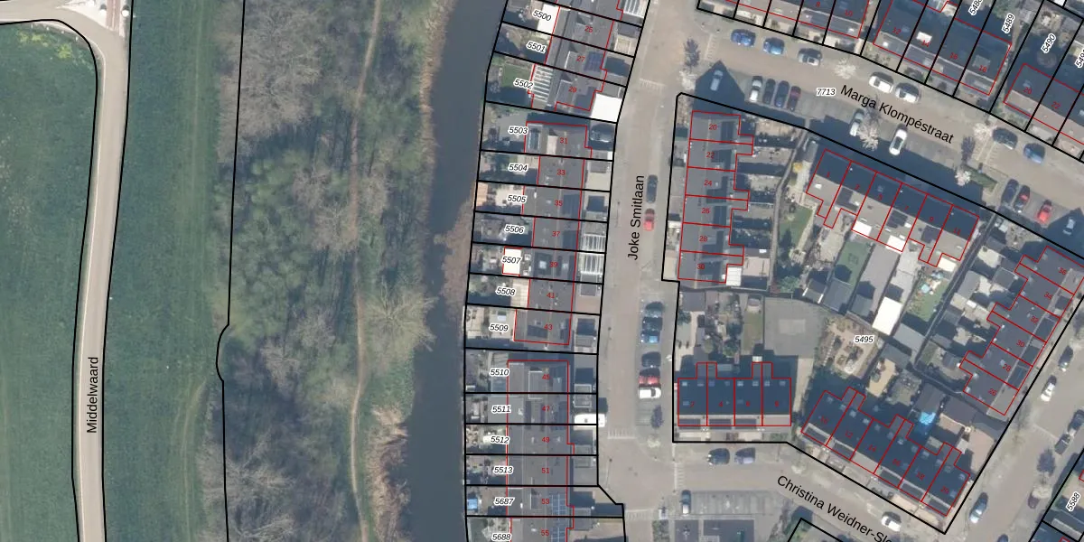 Joke Smitlaan 39 is gelegen op kadastraal perceel VAN00B5507. Deze kadastrale aanduiding is uniek en wordt gebruikt door het Kadaster om eigendomsrechten en andere zakelijke rechten vast te leggen. Het perceel maakt onderdeel uit van de kadastrale gemeente Vianen.