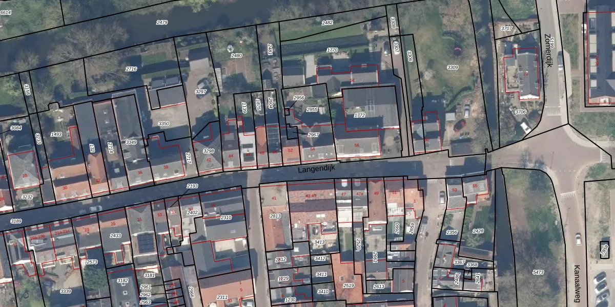 Langendijk 54 is gelegen op kadastraal perceel VAN00A2955. Deze kadastrale aanduiding is uniek en wordt gebruikt door het Kadaster om eigendomsrechten en andere zakelijke rechten vast te leggen. Het perceel maakt onderdeel uit van de kadastrale gemeente Vianen.