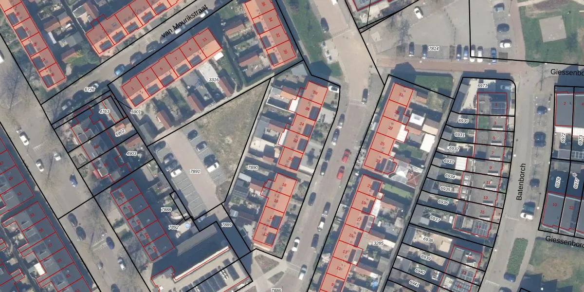 Het adres is gelegen op perceel 7890 in de sectie B en de kadastrale gemeente Vianen. De kadastrale aanduiding is aldus VAN00-B-7890. Het perceel is 1498 m² groot. Dat is kleiner dan de gemiddelde perceeloppervlakte in Vianen, dat op 3789,58 m² ligt. Het grootste perceel in de kadastrale gemeente is 61,8 ha. Het kleinste perceel heeft een oppervlakte van 0 m². Er zijn 9 adressen aanwezig op het perceel. De huidige grenzen van het perceel zijn digitaal in de Basisregistratie Kadaster (BRK) geregistreerd op 14-02-2024.