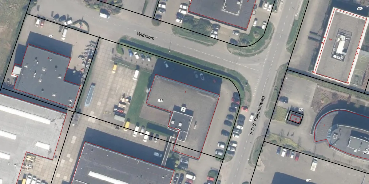 Het perceel waarop Witboom 1 staat heeft een oppervlakte van 3550 m². Dit is een zeer groot perceel. De perceeloppervlakte wordt geregistreerd door het Kadaster. Gedetailleerde informatie over de maten van dit perceel kunt u vinden in het rapport Kadastrale kaart met maatvoering van Witboom 1.
