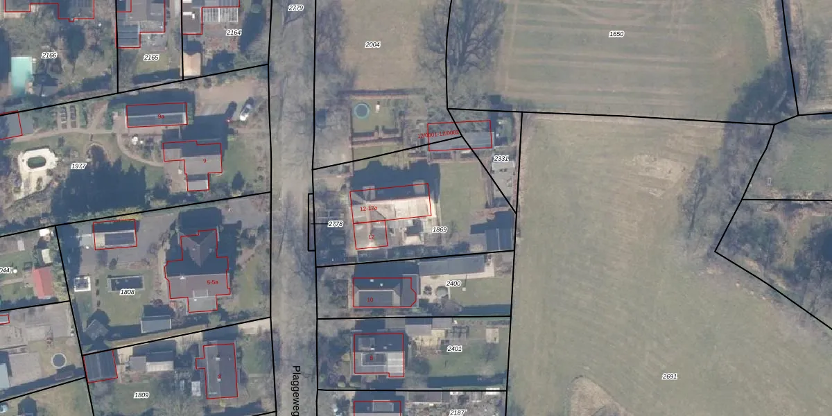 Plaggeweg 12-a is gelegen op kadastraal perceel NST01E1869. Deze kadastrale aanduiding is uniek en wordt gebruikt door het Kadaster om eigendomsrechten en andere zakelijke rechten vast te leggen. Het perceel maakt onderdeel uit van de kadastrale gemeente Nunspeet.