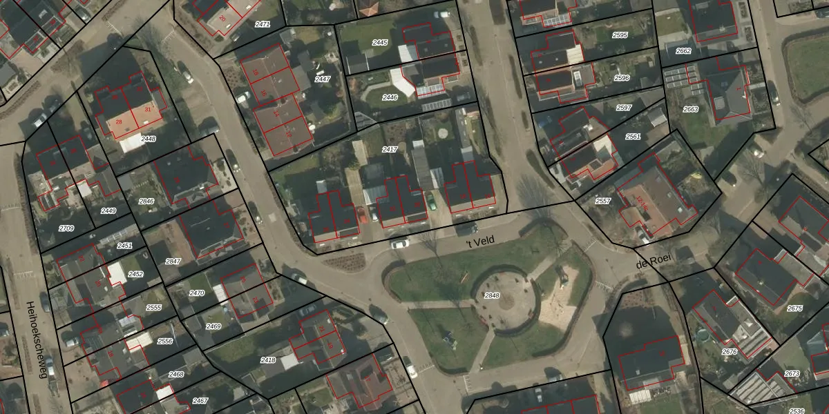 't Veld 20 is gelegen op kadastraal perceel VLB00C2417. Deze kadastrale aanduiding is uniek en wordt gebruikt door het Kadaster om eigendomsrechten en andere zakelijke rechten vast te leggen. Het perceel maakt onderdeel uit van de kadastrale gemeente Vierlingsbeek.