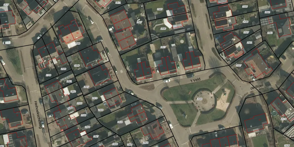 't Veld 24 is gelegen op kadastraal perceel VLB00C2417. Deze kadastrale aanduiding is uniek en wordt gebruikt door het Kadaster om eigendomsrechten en andere zakelijke rechten vast te leggen. Het perceel maakt onderdeel uit van de kadastrale gemeente Vierlingsbeek.
