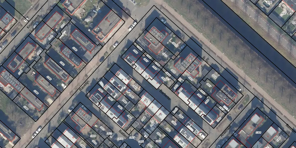 Het perceel waarop Barbette 11 staat heeft een oppervlakte van 91 m². Dit is een klein perceel. De perceeloppervlakte wordt geregistreerd door het Kadaster. Gedetailleerde informatie over de maten van dit perceel kunt u vinden in het rapport Kadastrale kaart met maatvoering van Barbette 11.