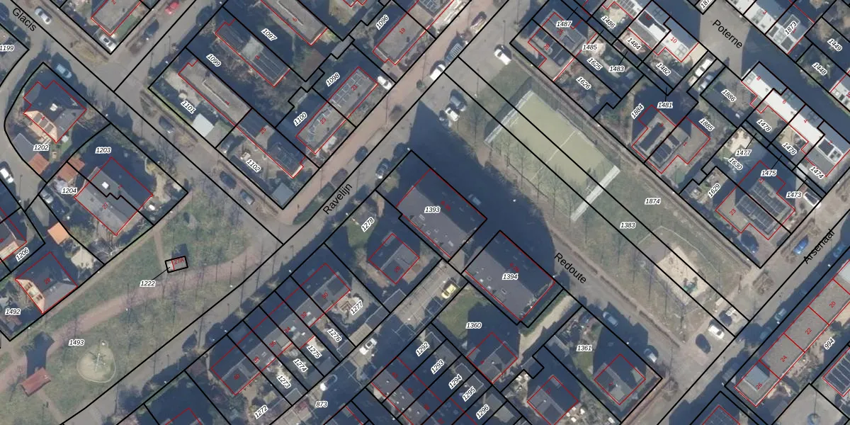 Het perceel waarop Redoute 24 staat heeft een oppervlakte van 325 m². Dit is een groot perceel. De perceeloppervlakte wordt geregistreerd door het Kadaster. Gedetailleerde informatie over de maten van dit perceel kunt u vinden in het rapport Kadastrale kaart met maatvoering van Redoute 24.