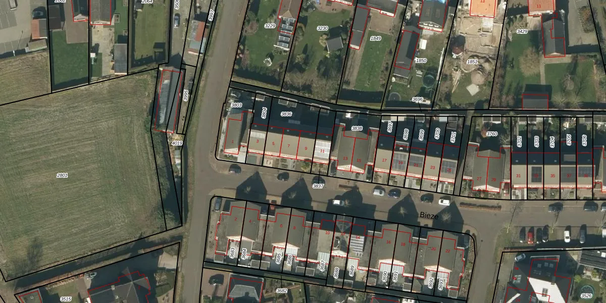Het perceel waarop Bieze 9 staat heeft een oppervlakte van 370 m². Dit is een groot perceel. De perceeloppervlakte wordt geregistreerd door het Kadaster. Gedetailleerde informatie over de maten van dit perceel kunt u vinden in het rapport Kadastrale kaart met maatvoering van Bieze 9.