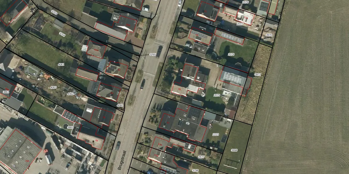Het perceel waarop Brugstraat 55 staat heeft een oppervlakte van 1306 m². Dit is een zeer groot perceel. De perceeloppervlakte wordt geregistreerd door het Kadaster. Gedetailleerde informatie over de maten van dit perceel kunt u vinden in het rapport Kadastrale kaart met maatvoering van Brugstraat 55.