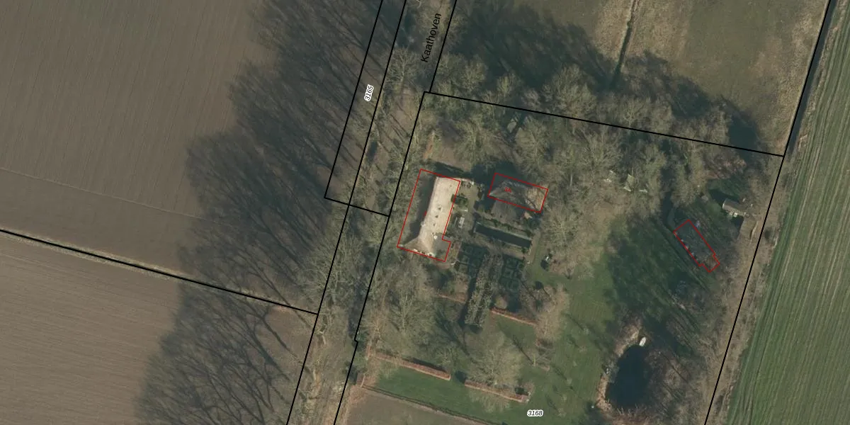Het perceel waarop Kaathoven 3 staat heeft een oppervlakte van 1,3 ha. Dit is een zeer groot perceel. De perceeloppervlakte wordt geregistreerd door het Kadaster. Gedetailleerde informatie over de maten van dit perceel kunt u vinden in het rapport Kadastrale kaart met maatvoering van Kaathoven 3.