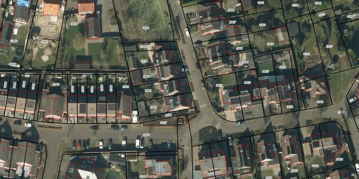 Platanenstraat 49 is gelegen op kadastraal perceel NLD03C2881. Deze kadastrale aanduiding is uniek en wordt gebruikt door het Kadaster om eigendomsrechten en andere zakelijke rechten vast te leggen. Het perceel maakt onderdeel uit van de kadastrale gemeente Nuland.