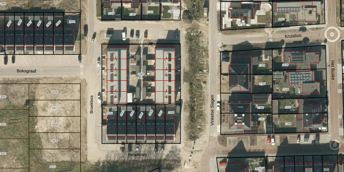 Vinkelse Slagen 21 is gelegen op kadastraal perceel NLD03E2869. Deze kadastrale aanduiding is uniek en wordt gebruikt door het Kadaster om eigendomsrechten en andere zakelijke rechten vast te leggen. Het perceel maakt onderdeel uit van de kadastrale gemeente Nuland.