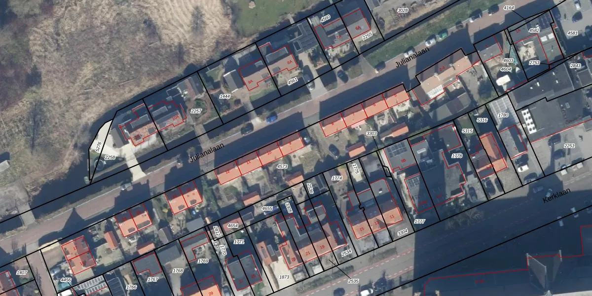 Het perceel waarop Julianalaan 9 staat heeft een oppervlakte van 2792 m². Dit is een zeer groot perceel. De perceeloppervlakte wordt geregistreerd door het Kadaster. Gedetailleerde informatie over de maten van dit perceel kunt u vinden in het rapport Kadastrale kaart met maatvoering van Julianalaan 9.