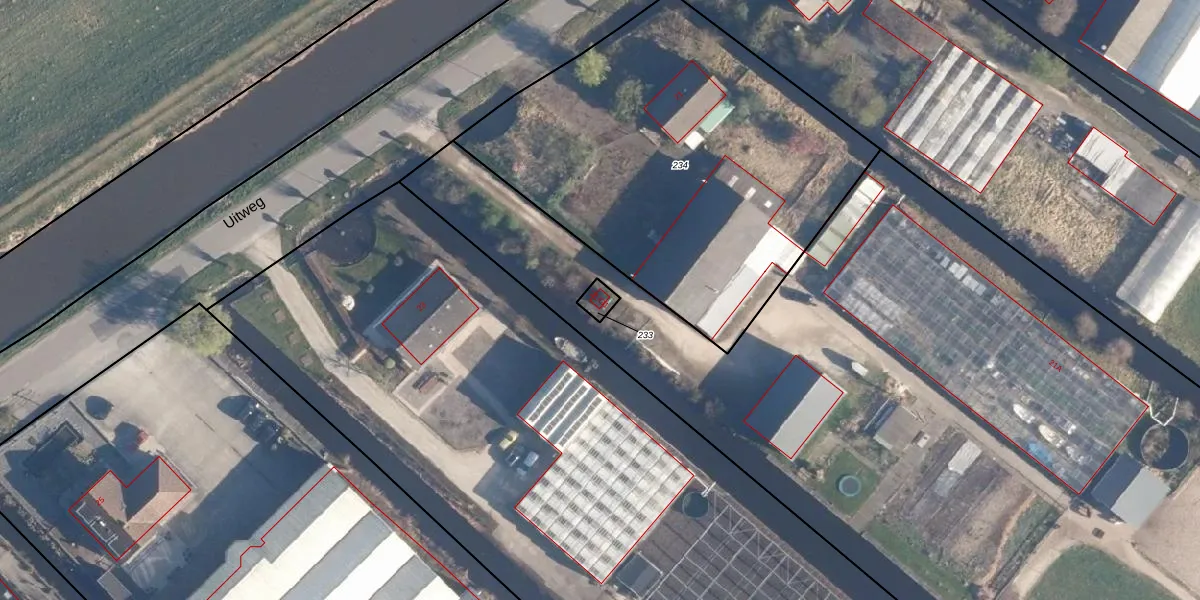 Uitweg 21-G1 is gelegen op kadastraal perceel VKV00G233. Deze kadastrale aanduiding is uniek en wordt gebruikt door het Kadaster om eigendomsrechten en andere zakelijke rechten vast te leggen. Het perceel maakt onderdeel uit van de kadastrale gemeente Vinkeveen.