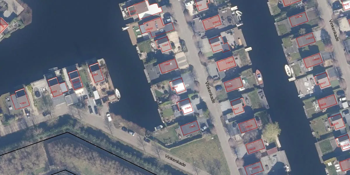 Vinkenkade 77-R-7 is gelegen op kadastraal perceel VKV00H2079. Deze kadastrale aanduiding is uniek en wordt gebruikt door het Kadaster om eigendomsrechten en andere zakelijke rechten vast te leggen. Het perceel maakt onderdeel uit van de kadastrale gemeente Vinkeveen.