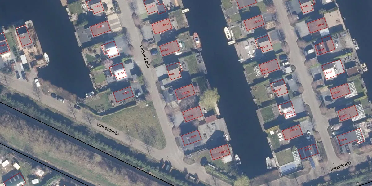Vinkenkade 77-R-18 is gelegen op kadastraal perceel VKV00H2079. Deze kadastrale aanduiding is uniek en wordt gebruikt door het Kadaster om eigendomsrechten en andere zakelijke rechten vast te leggen. Het perceel maakt onderdeel uit van de kadastrale gemeente Vinkeveen.