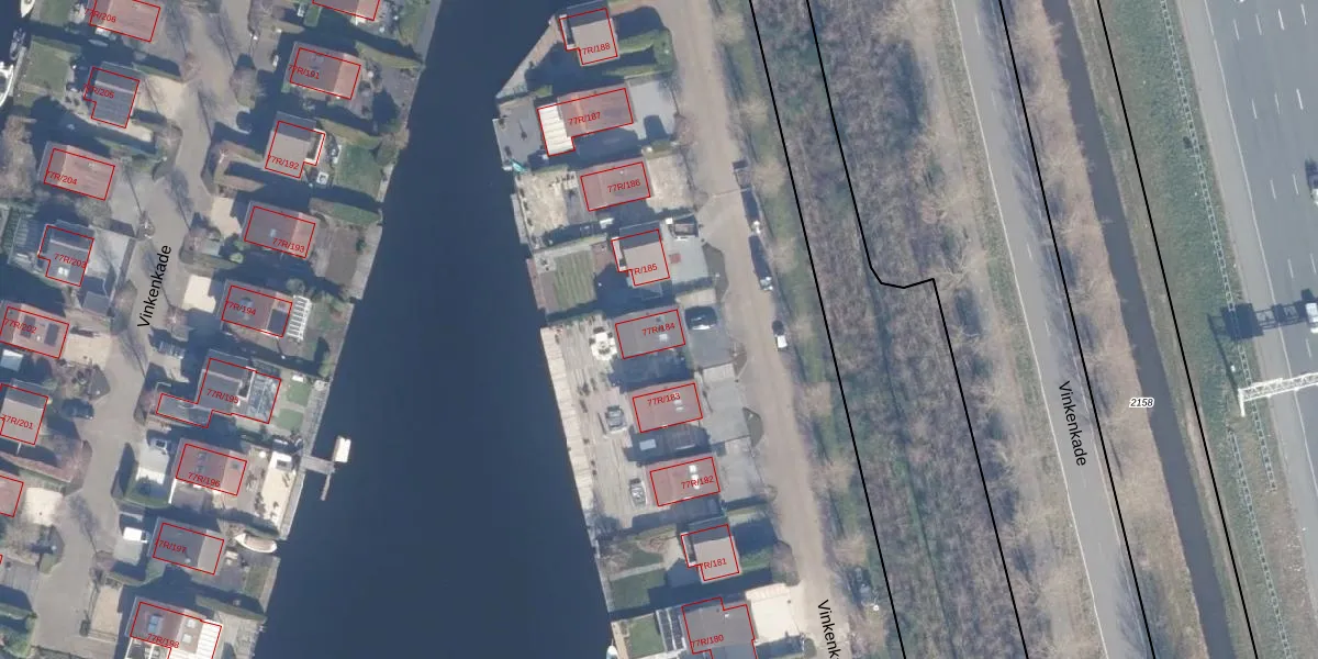 Vinkenkade 77-R-184 is gelegen op kadastraal perceel VKV00H2079. Deze kadastrale aanduiding is uniek en wordt gebruikt door het Kadaster om eigendomsrechten en andere zakelijke rechten vast te leggen. Het perceel maakt onderdeel uit van de kadastrale gemeente Vinkeveen.