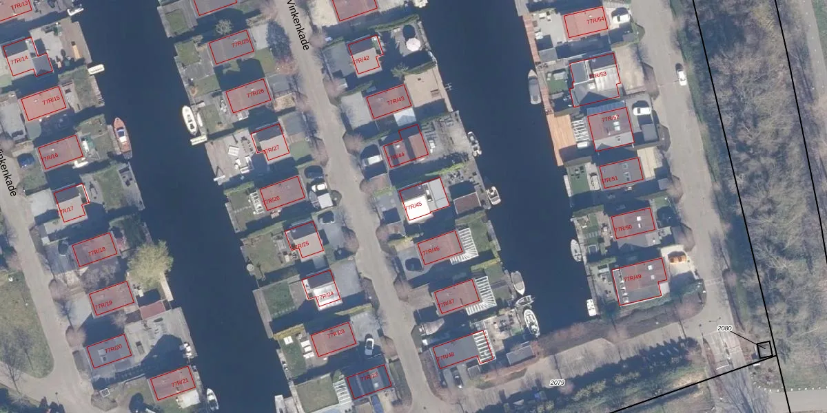 Vinkenkade 77-R-45 is gelegen op kadastraal perceel VKV00H2079. Deze kadastrale aanduiding is uniek en wordt gebruikt door het Kadaster om eigendomsrechten en andere zakelijke rechten vast te leggen. Het perceel maakt onderdeel uit van de kadastrale gemeente Vinkeveen.