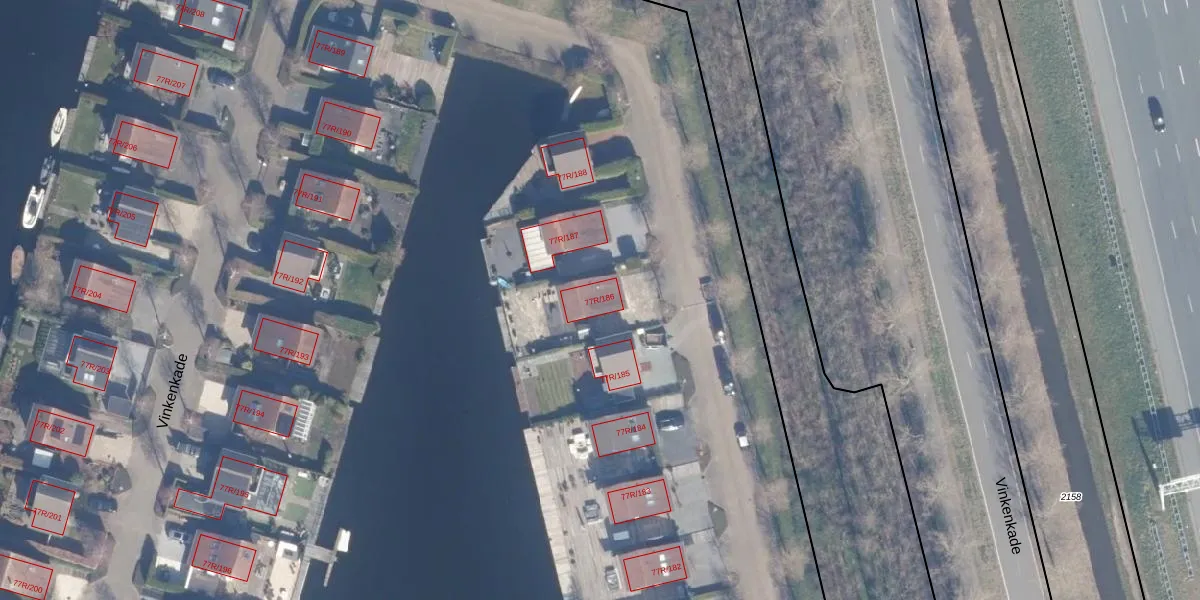 Vinkenkade 77-R-186 is gelegen op kadastraal perceel VKV00H2079. Deze kadastrale aanduiding is uniek en wordt gebruikt door het Kadaster om eigendomsrechten en andere zakelijke rechten vast te leggen. Het perceel maakt onderdeel uit van de kadastrale gemeente Vinkeveen.