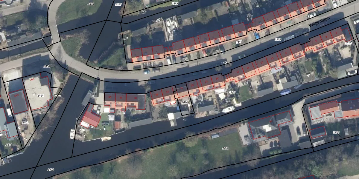 Wilgenlaan 25 is gelegen op kadastraal perceel VKV00D1410. Deze kadastrale aanduiding is uniek en wordt gebruikt door het Kadaster om eigendomsrechten en andere zakelijke rechten vast te leggen. Het perceel maakt onderdeel uit van de kadastrale gemeente Vinkeveen.