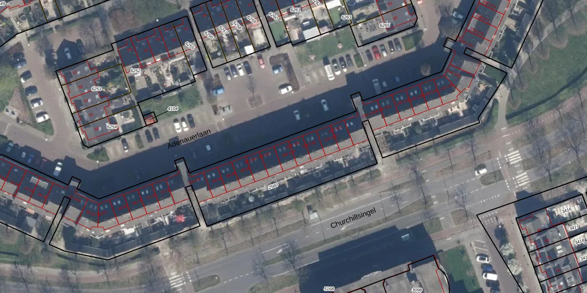 Het perceel waarop Adenauerlaan 106 staat heeft een oppervlakte van 6460 m². Dit is een zeer groot perceel. De perceeloppervlakte wordt geregistreerd door het Kadaster. Gedetailleerde informatie over de maten van dit perceel kunt u vinden in het rapport Kadastrale kaart met maatvoering van Adenauerlaan 106.