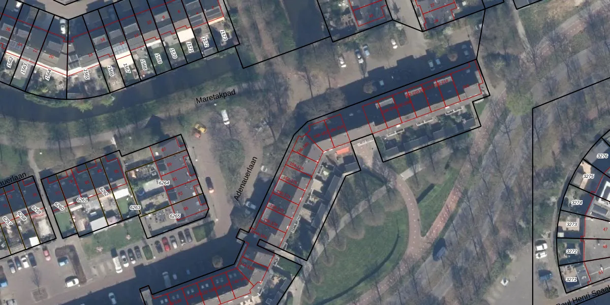 Het perceel waarop Adenauerlaan 166 staat heeft een oppervlakte van 6460 m². Dit is een zeer groot perceel. De perceeloppervlakte wordt geregistreerd door het Kadaster. Gedetailleerde informatie over de maten van dit perceel kunt u vinden in het rapport Kadastrale kaart met maatvoering van Adenauerlaan 166.