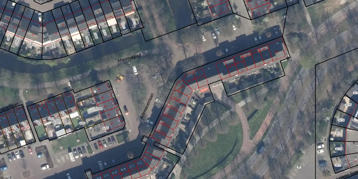 Het perceel waarop Adenauerlaan 180 staat heeft een oppervlakte van 6460 m². Dit is een zeer groot perceel. De perceeloppervlakte wordt geregistreerd door het Kadaster. Gedetailleerde informatie over de maten van dit perceel kunt u vinden in het rapport Kadastrale kaart met maatvoering van Adenauerlaan 180.