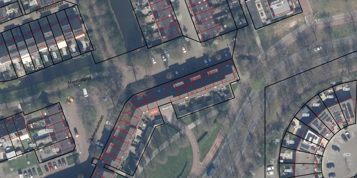 Het perceel waarop Adenauerlaan 206 staat heeft een oppervlakte van 6460 m². Dit is een zeer groot perceel. De perceeloppervlakte wordt geregistreerd door het Kadaster. Gedetailleerde informatie over de maten van dit perceel kunt u vinden in het rapport Kadastrale kaart met maatvoering van Adenauerlaan 206.