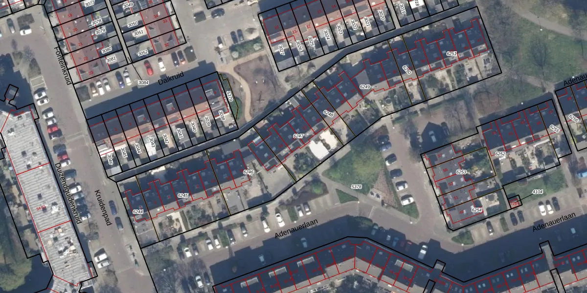 Het perceel waarop Adenauerlaan 21 staat heeft een oppervlakte van 493 m². Dit is een groot perceel. De perceeloppervlakte wordt geregistreerd door het Kadaster. Gedetailleerde informatie over de maten van dit perceel kunt u vinden in het rapport Kadastrale kaart met maatvoering van Adenauerlaan 21.