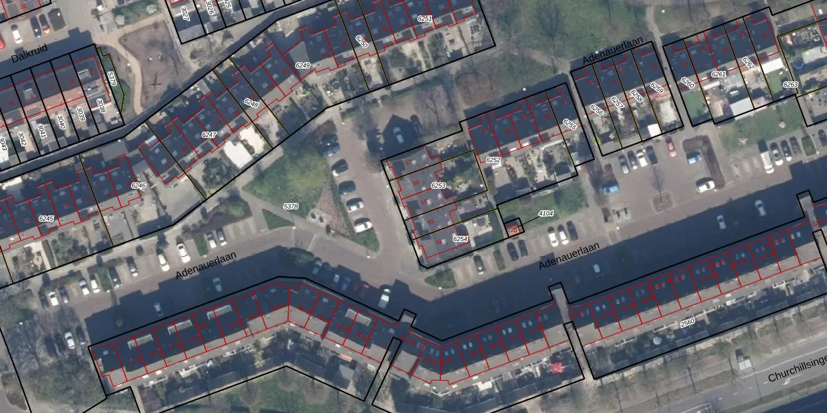 Adenauerlaan 53 is gelegen op kadastraal perceel VDG00K6253. Deze kadastrale aanduiding is uniek en wordt gebruikt door het Kadaster om eigendomsrechten en andere zakelijke rechten vast te leggen. Het perceel maakt onderdeel uit van de kadastrale gemeente Vlaardingen.