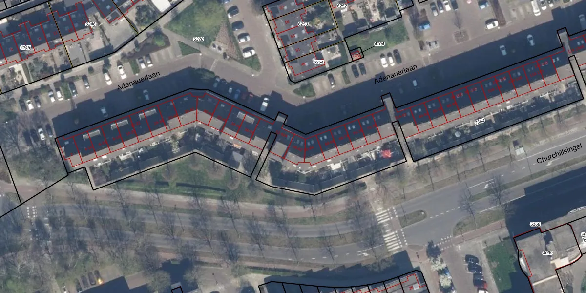 Adenauerlaan 56 is gelegen op kadastraal perceel VDG00K2560. Deze kadastrale aanduiding is uniek en wordt gebruikt door het Kadaster om eigendomsrechten en andere zakelijke rechten vast te leggen. Het perceel maakt onderdeel uit van de kadastrale gemeente Vlaardingen.