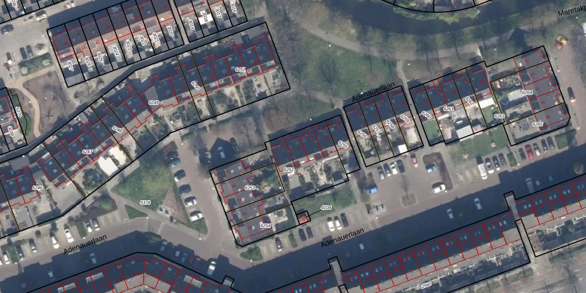 Het perceel waarop Adenauerlaan 61 staat heeft een oppervlakte van 702 m². Dit is een groot perceel. De perceeloppervlakte wordt geregistreerd door het Kadaster. Gedetailleerde informatie over de maten van dit perceel kunt u vinden in het rapport Kadastrale kaart met maatvoering van Adenauerlaan 61.