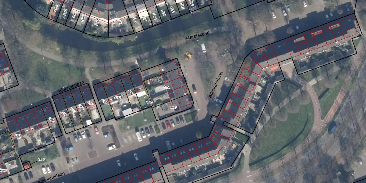 Adenauerlaan 93 is gelegen op kadastraal perceel VDG00K6264. Deze kadastrale aanduiding is uniek en wordt gebruikt door het Kadaster om eigendomsrechten en andere zakelijke rechten vast te leggen. Het perceel maakt onderdeel uit van de kadastrale gemeente Vlaardingen.