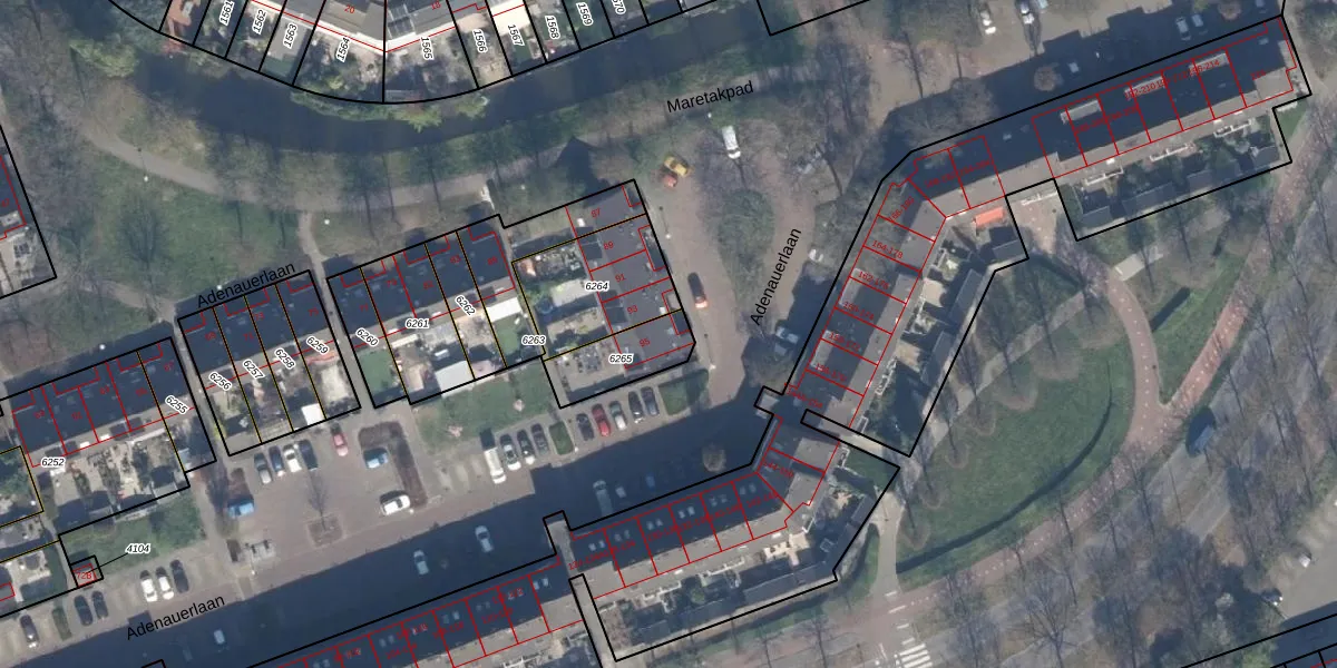 Adenauerlaan 95 is gelegen op kadastraal perceel VDG00K6265. Deze kadastrale aanduiding is uniek en wordt gebruikt door het Kadaster om eigendomsrechten en andere zakelijke rechten vast te leggen. Het perceel maakt onderdeel uit van de kadastrale gemeente Vlaardingen.