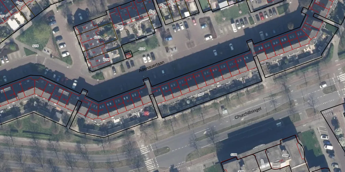 Het perceel waarop Adenauerlaan 96 staat heeft een oppervlakte van 6460 m². Dit is een zeer groot perceel. De perceeloppervlakte wordt geregistreerd door het Kadaster. Gedetailleerde informatie over de maten van dit perceel kunt u vinden in het rapport Kadastrale kaart met maatvoering van Adenauerlaan 96.