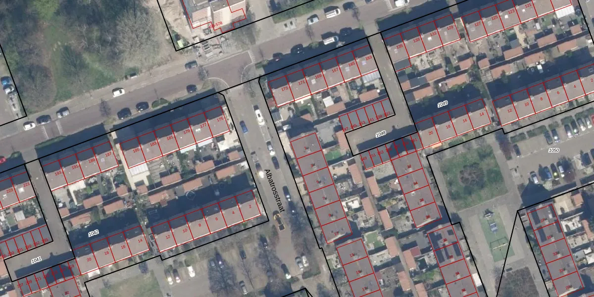 Het perceel waarop Albatrosstraat 1 staat heeft een oppervlakte van 7245 m². Dit is een zeer groot perceel. De perceeloppervlakte wordt geregistreerd door het Kadaster. Gedetailleerde informatie over de maten van dit perceel kunt u vinden in het rapport Kadastrale kaart met maatvoering van Albatrosstraat 1.