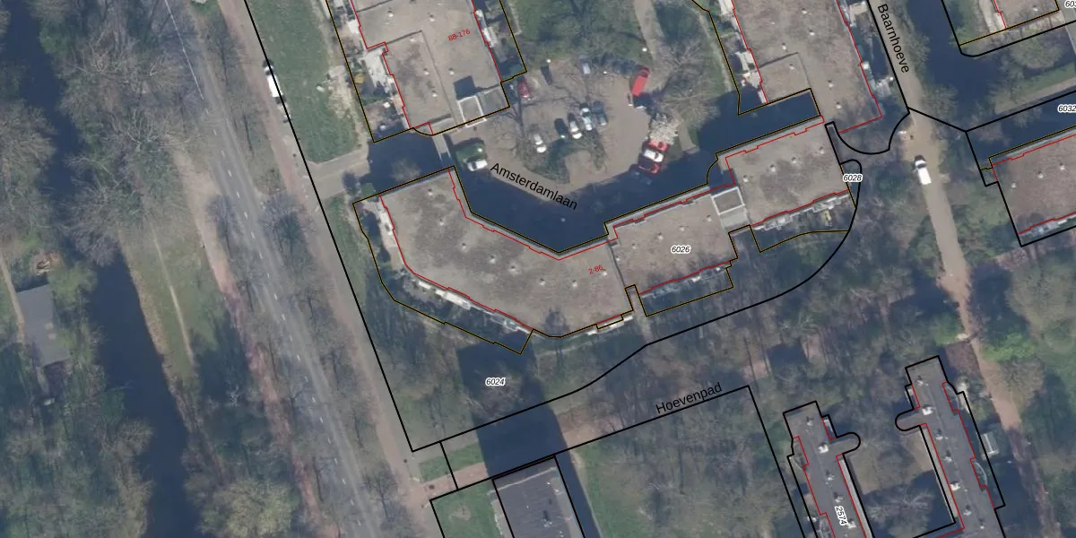 Het perceel waarop Amsterdamlaan 18 staat heeft een oppervlakte van 3198 m². Dit is een zeer groot perceel. De perceeloppervlakte wordt geregistreerd door het Kadaster. Gedetailleerde informatie over de maten van dit perceel kunt u vinden in het rapport Kadastrale kaart met maatvoering van Amsterdamlaan 18.