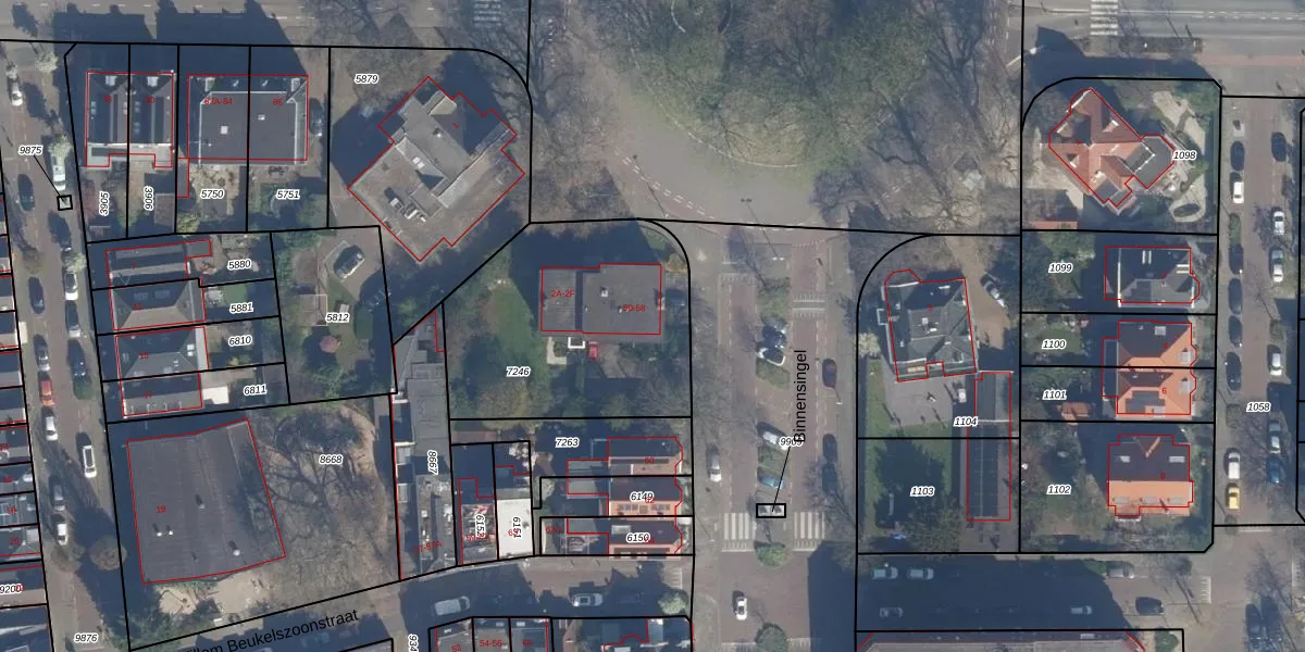 Het perceel waarop Binnensingel 56 staat heeft een oppervlakte van 1020 m². Dit is een zeer groot perceel. De perceeloppervlakte wordt geregistreerd door het Kadaster. Gedetailleerde informatie over de maten van dit perceel kunt u vinden in het rapport Kadastrale kaart met maatvoering van Binnensingel 56.
