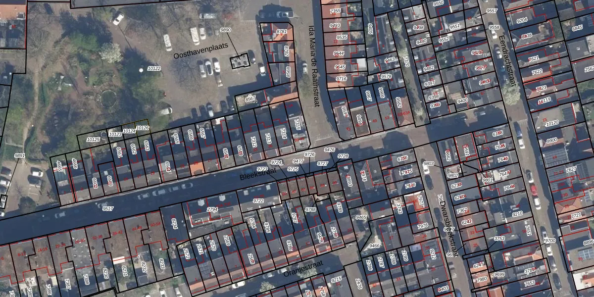 Het perceel waarop Bleekstraat 39 staat heeft een oppervlakte van 95 m². Dit is een klein perceel. De perceeloppervlakte wordt geregistreerd door het Kadaster. Gedetailleerde informatie over de maten van dit perceel kunt u vinden in het rapport Kadastrale kaart met maatvoering van Bleekstraat 39.