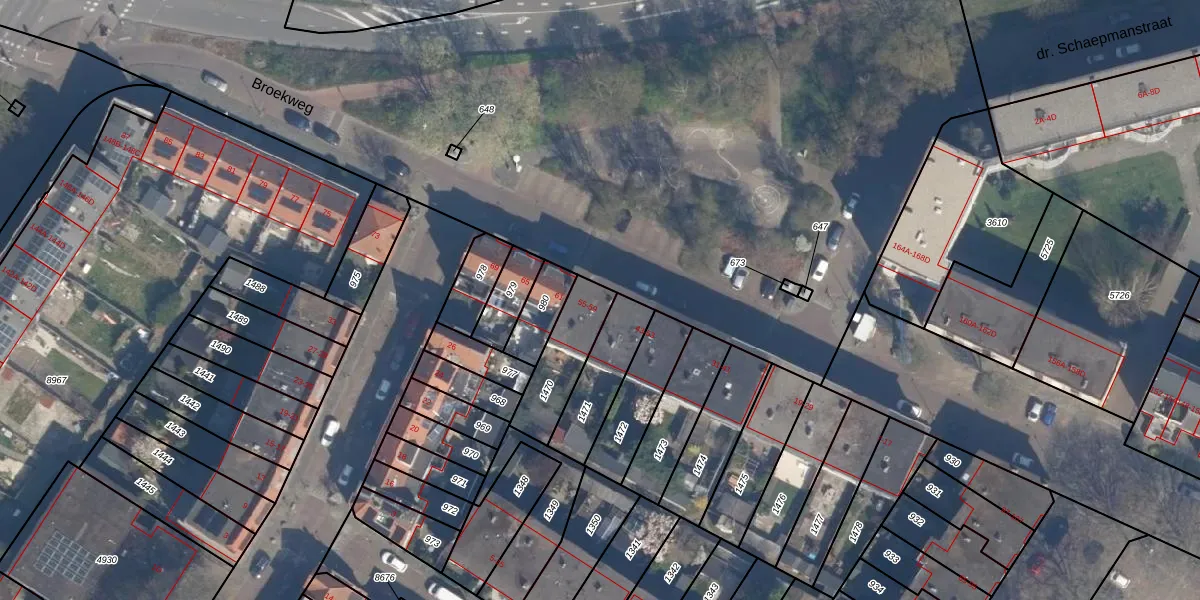 Broekweg 55 is gelegen op kadastraal perceel VDG00D1470. Deze kadastrale aanduiding is uniek en wordt gebruikt door het Kadaster om eigendomsrechten en andere zakelijke rechten vast te leggen. Het perceel maakt onderdeel uit van de kadastrale gemeente Vlaardingen.