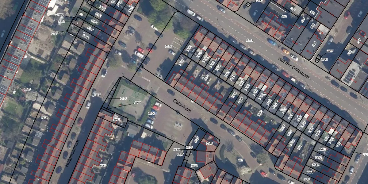 Het perceel waarop Catsstraat 34 staat heeft een oppervlakte van 504 m². Dit is een groot perceel. De perceeloppervlakte wordt geregistreerd door het Kadaster. Gedetailleerde informatie over de maten van dit perceel kunt u vinden in het rapport Kadastrale kaart met maatvoering van Catsstraat 34.