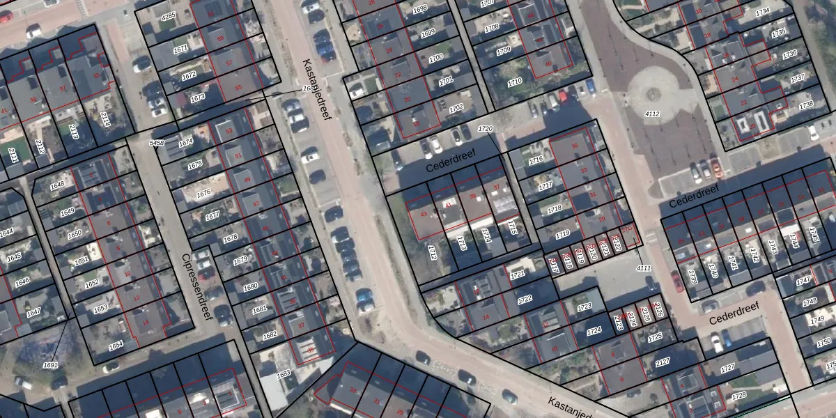 Cederdreef 43 is gelegen op kadastraal perceel VDG00K1712. Deze kadastrale aanduiding is uniek en wordt gebruikt door het Kadaster om eigendomsrechten en andere zakelijke rechten vast te leggen. Het perceel maakt onderdeel uit van de kadastrale gemeente Vlaardingen.