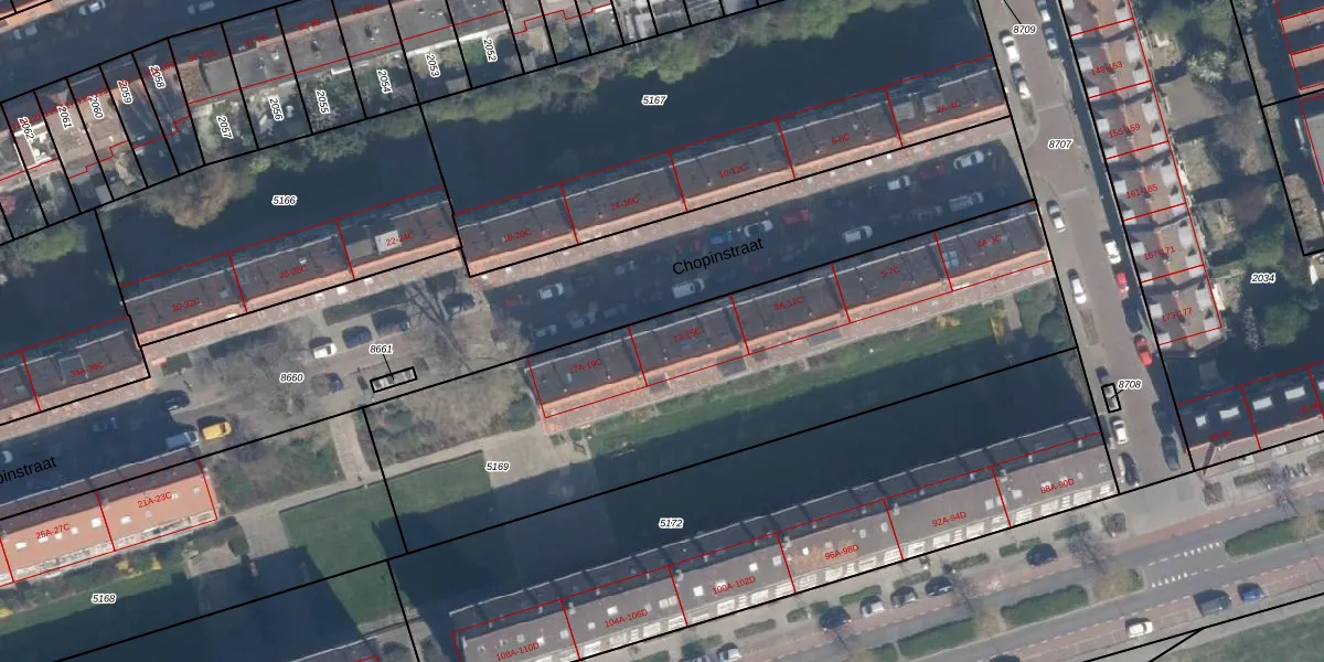 Het perceel waarop Chopinstraat 15-C staat heeft een oppervlakte van 2447 m². Dit is een zeer groot perceel. De perceeloppervlakte wordt geregistreerd door het Kadaster. Gedetailleerde informatie over de maten van dit perceel kunt u vinden in het rapport Kadastrale kaart met maatvoering van Chopinstraat 15-C.