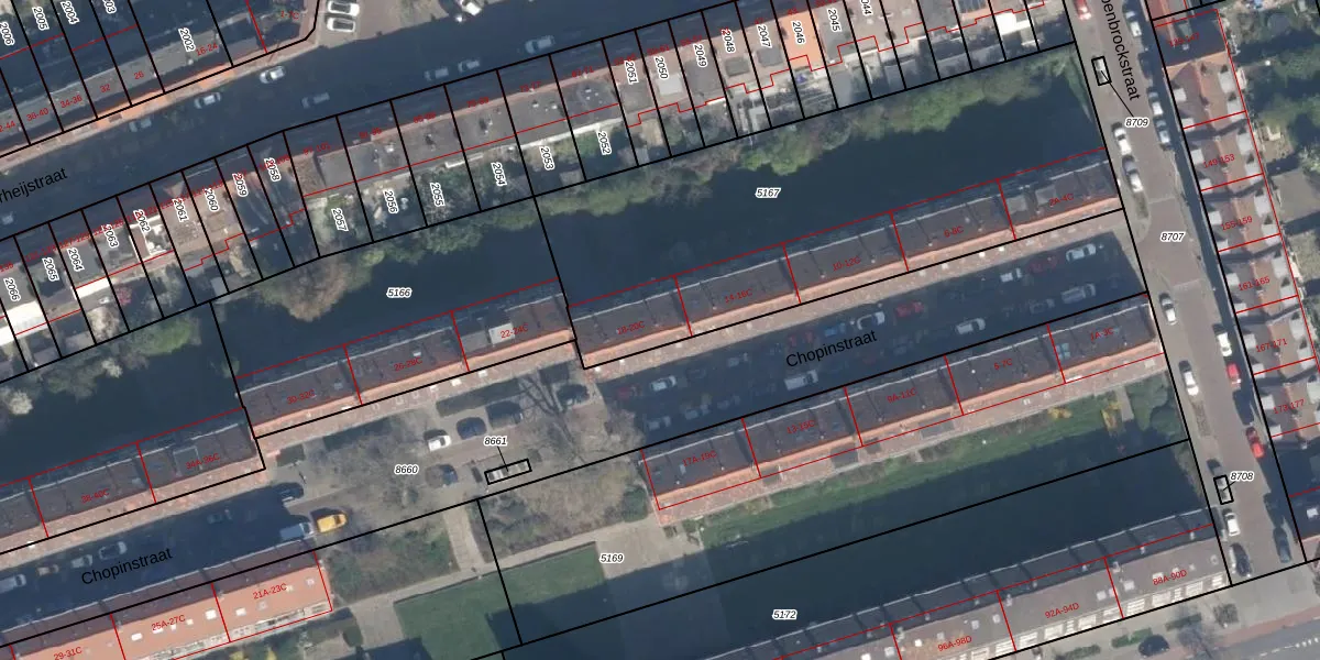 Het perceel waarop Chopinstraat 18-A staat heeft een oppervlakte van 2280 m². Dit is een zeer groot perceel. De perceeloppervlakte wordt geregistreerd door het Kadaster. Gedetailleerde informatie over de maten van dit perceel kunt u vinden in het rapport Kadastrale kaart met maatvoering van Chopinstraat 18-A.