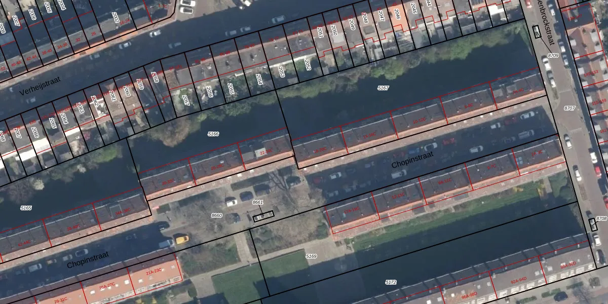 Het perceel waarop Chopinstraat 20-C staat heeft een oppervlakte van 2280 m². Dit is een zeer groot perceel. De perceeloppervlakte wordt geregistreerd door het Kadaster. Gedetailleerde informatie over de maten van dit perceel kunt u vinden in het rapport Kadastrale kaart met maatvoering van Chopinstraat 20-C.