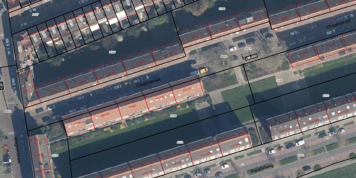 Het perceel waarop Chopinstraat 23-A staat heeft een oppervlakte van 2462 m². Dit is een zeer groot perceel. De perceeloppervlakte wordt geregistreerd door het Kadaster. Gedetailleerde informatie over de maten van dit perceel kunt u vinden in het rapport Kadastrale kaart met maatvoering van Chopinstraat 23-A.