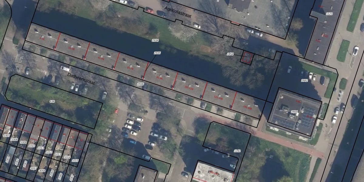 Het perceel waarop Datheenstraat 119 staat heeft een oppervlakte van 1443 m². Dit is een zeer groot perceel. De perceeloppervlakte wordt geregistreerd door het Kadaster. Gedetailleerde informatie over de maten van dit perceel kunt u vinden in het rapport Kadastrale kaart met maatvoering van Datheenstraat 119.