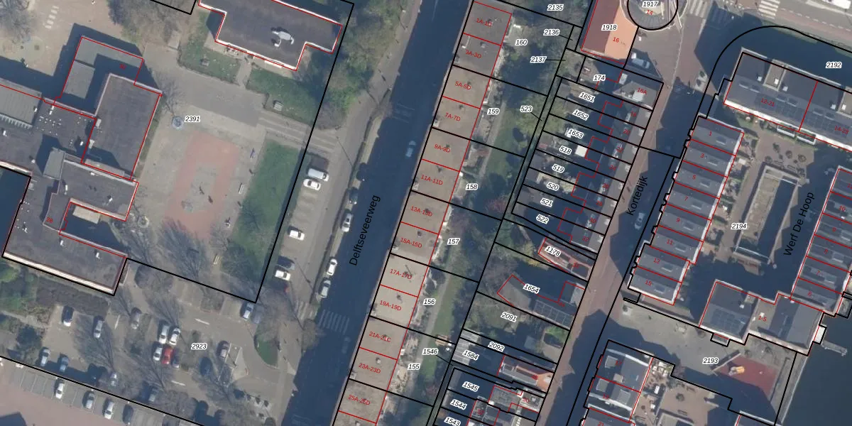 Het perceel waarop Delftseveerweg 13-D staat heeft een oppervlakte van 349 m². Dit is een groot perceel. De perceeloppervlakte wordt geregistreerd door het Kadaster. Gedetailleerde informatie over de maten van dit perceel kunt u vinden in het rapport Kadastrale kaart met maatvoering van Delftseveerweg 13-D.