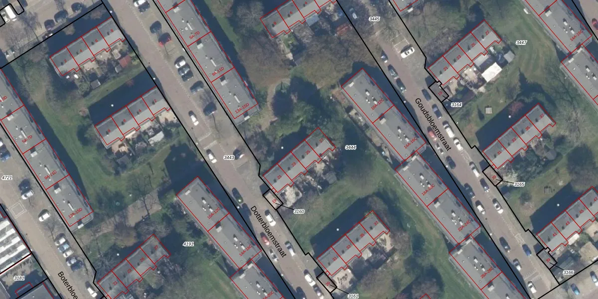 Het perceel waarop Dotterbloemstraat 25 staat heeft een oppervlakte van 8666 m². Dit is een zeer groot perceel. De perceeloppervlakte wordt geregistreerd door het Kadaster. Gedetailleerde informatie over de maten van dit perceel kunt u vinden in het rapport Kadastrale kaart met maatvoering van Dotterbloemstraat 25.